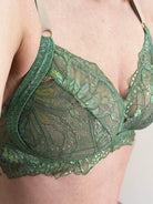 Crafted with the most magical and luxurious iridescent stretch lace, the Psyche Iridescent Lace bralette comes in standard and boost sizing.  Both options feature a soft wireless half lined soft cup and elastic detail that creates the illusion of an underwire.