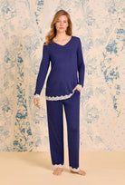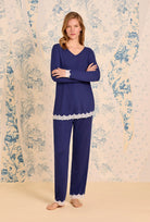 This soft sweater knit PJ set from Eileen West is designed with a top featuring a V-neckline, with gorgeous 2" embroidered lace-trimmed sleeve openings and hemline. The matching long bottom has an elastic waist with a drawcord and side seam pockets. It is finished with the exquisite embroidered lace on the leg openings.