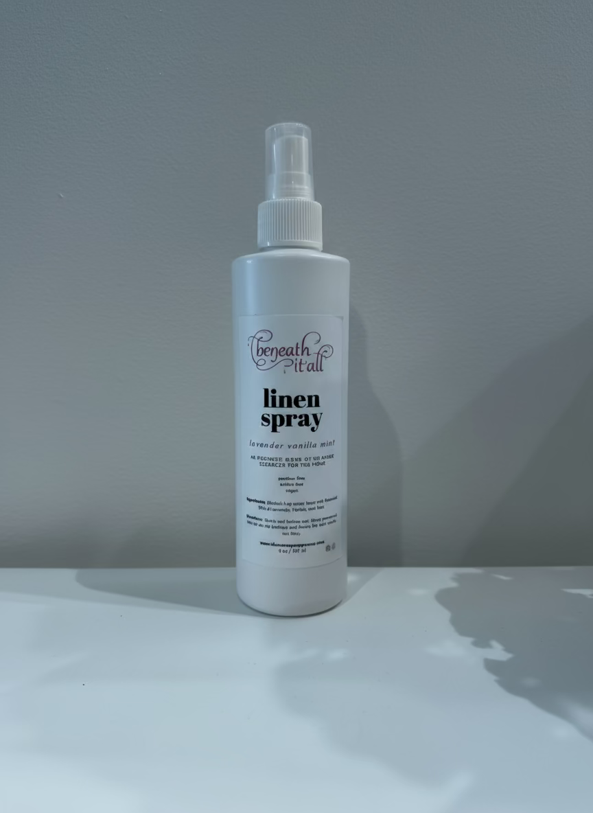 Linen & Pillow Spray for the eco-conscious. Made with pure essential oils, you can rest easy knowing you are freshening your home with steam-stilled plant essences, never chemicals. All in Beneath It All’s signature scent!