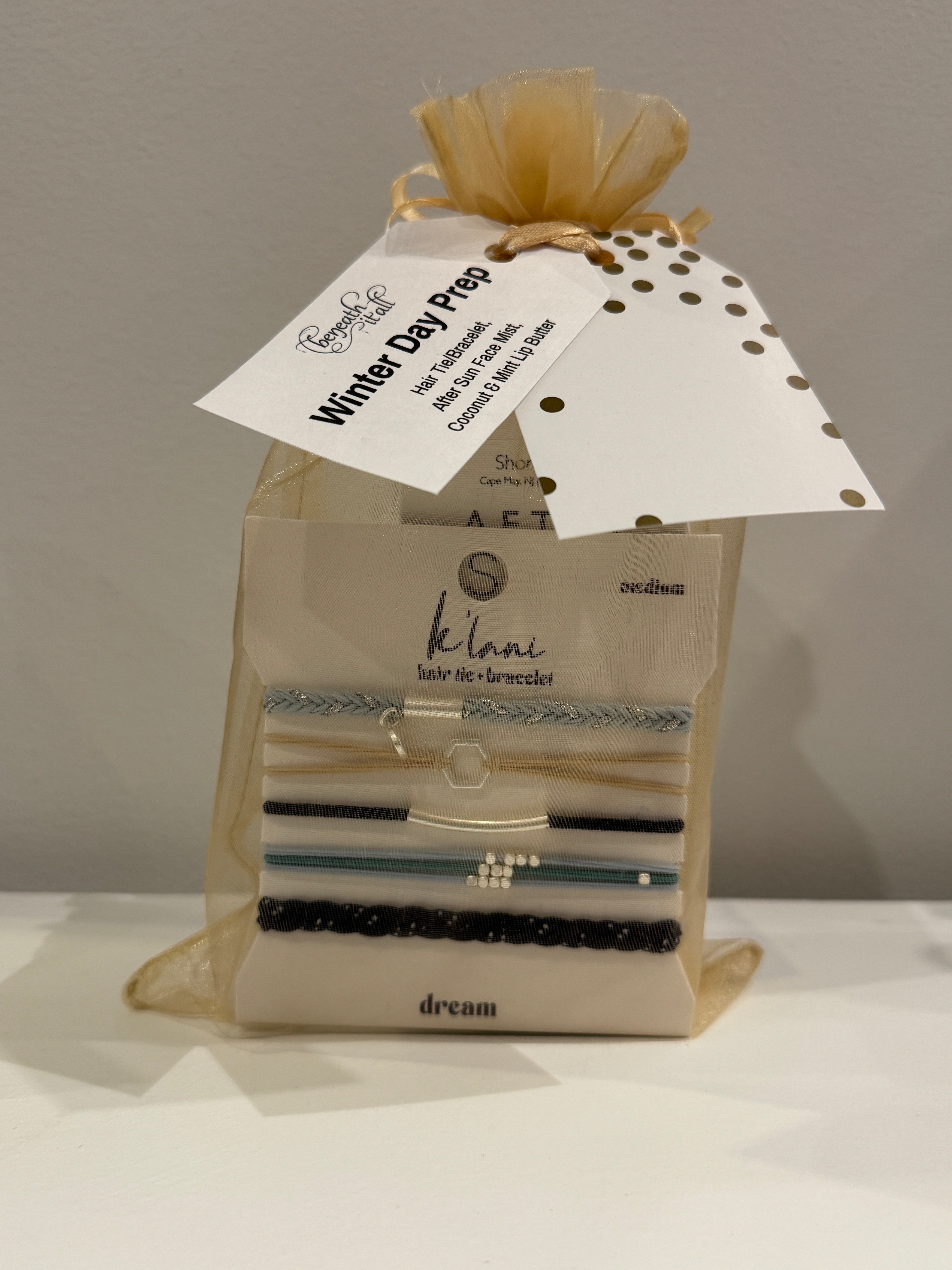 This set contains: Hair ties from K'lani (looks like a bracelet, acts like a hairtie!), after sun face mist, and a coconut & mint lip butter.
