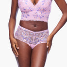 Cosabella’s colorful Paradiso lace is crafted in Italy using a variety of shine and matte yarns, creating a vibrant multi-dimensional effect. The Paradiso collection offers a romantic and feminine feel, perfect for enhancing your everyday lingerie. This style is a v-front mid-rise hipster.