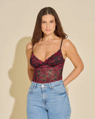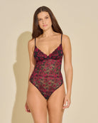 Cosabella’s stunning Savona collection features supportive, everyday intimates elevated with high-shine, two-tone floral lace. This wireless lace bodysuit features detailed floral lace with adjustable straps and a thong back with minimal rear coverage.