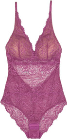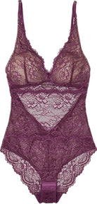 This bodysuit features built-up front straps that provide support, stretch lace for a fitted silhouette, deep plunge sexy neckline, adjustable shoulder straps, and cotton crotch lining with adjustable hook & eye closure
