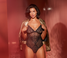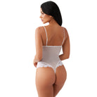 Lace bodysuit with a sultry floral pattern and scalloped edge, stretch mesh in back, and fully adjustable straps for a customized fit.  Featuring gold hardware, pull-on style, thong-back, with cotton gusset (no hook-and-eye).