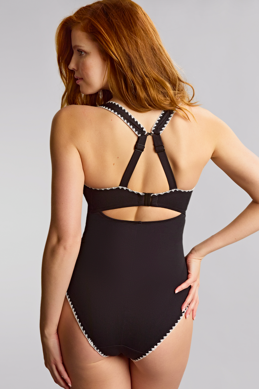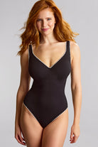 The Lara Swimsuit from Panache is perfect for the minimalist who still appreciates a thoughtful detail. White whipstitch trim along the edges pops against the black fabric, adding just the right touch of contrast. Crafted from luxurious honeycomb-textured fabric, this style is designed to beautifully flatter your curves. It features hidden underwires, seamless cups, convertible and adjustable J-hook straps, and light tummy control for comfortable, confident support.