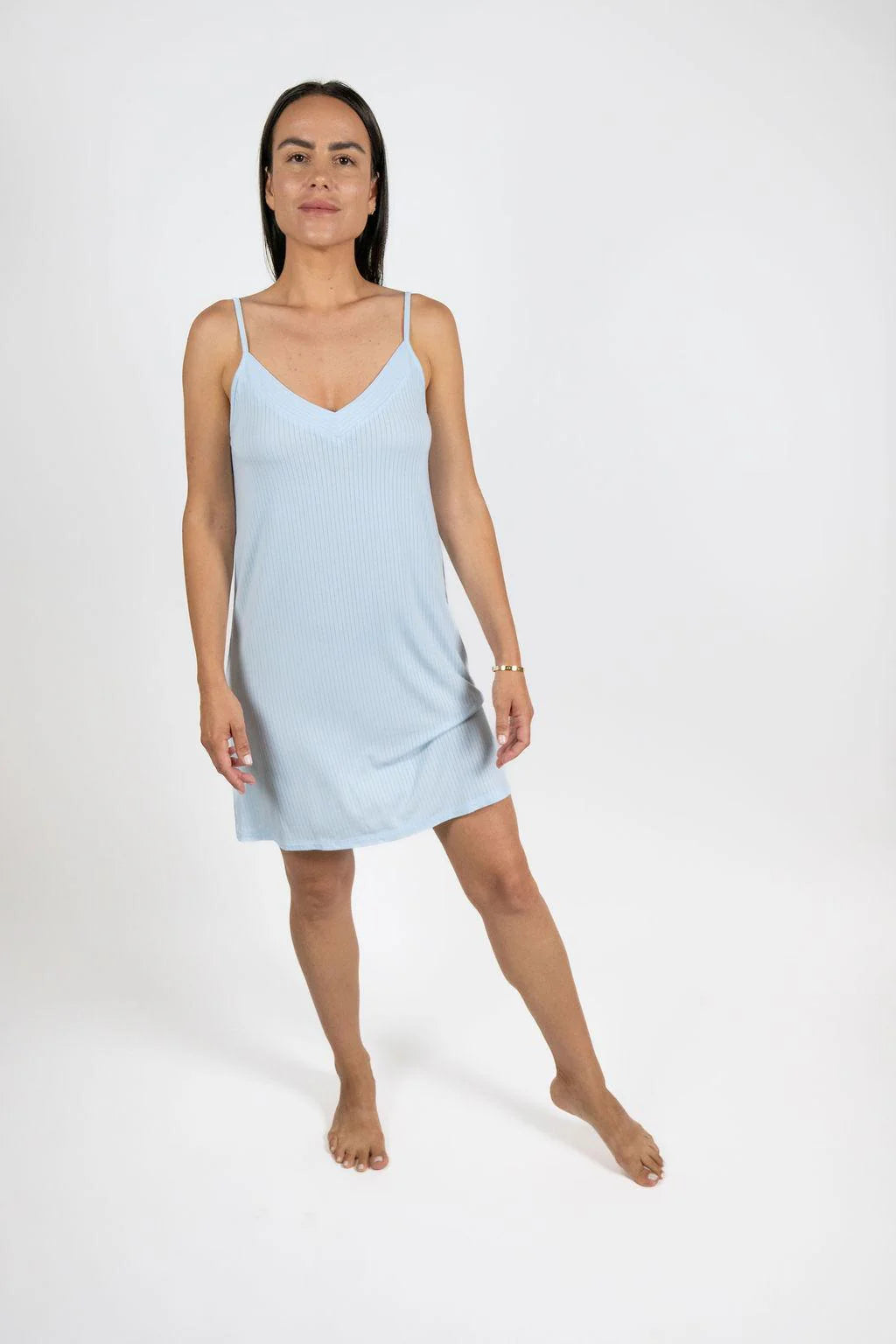 Cannes Pinstripe Chemise in Cool Blue from Aspen Dream is a lightweight women’s chemise (nightgown) with a subtle pinstripe texture, a V-neckline, and adjustable straps for a customizable fit. Designed with a relaxed midi silhouette and gentle stretch, it's perfect for breathable sleepwear and easy loungewear.