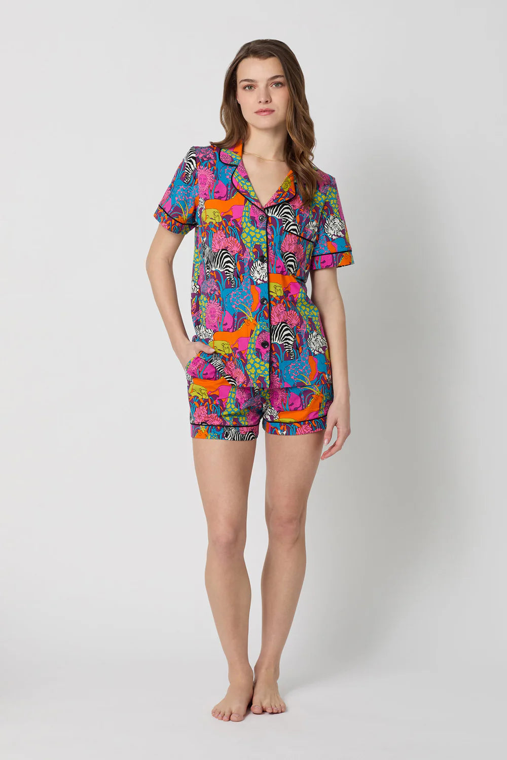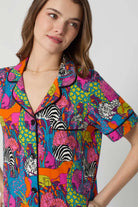 Vibrant and flirty, this shorty PJ set from Bedhead's collab with Trina Turk features a bold and colorful jungle-animal print. The short-sleeve, button-up top pairs effortlessly with the matching shorts for the perfect lounge-ready set. The top features a front button placket, front patch pocket, notch collar, and contrast piping. The shorts are finished with an elastic waistband, side pockets, and a banded hem with contrast piping. Both pieces are made of buttery-soft organic cotton jersey.