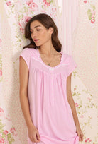 Soft yarn dye stripes in Eileen West’s classic cap sleeve waltz nightgown style. It features baby ruffles along the neckline, a flower-shaped button placket and ruffled hemline.