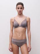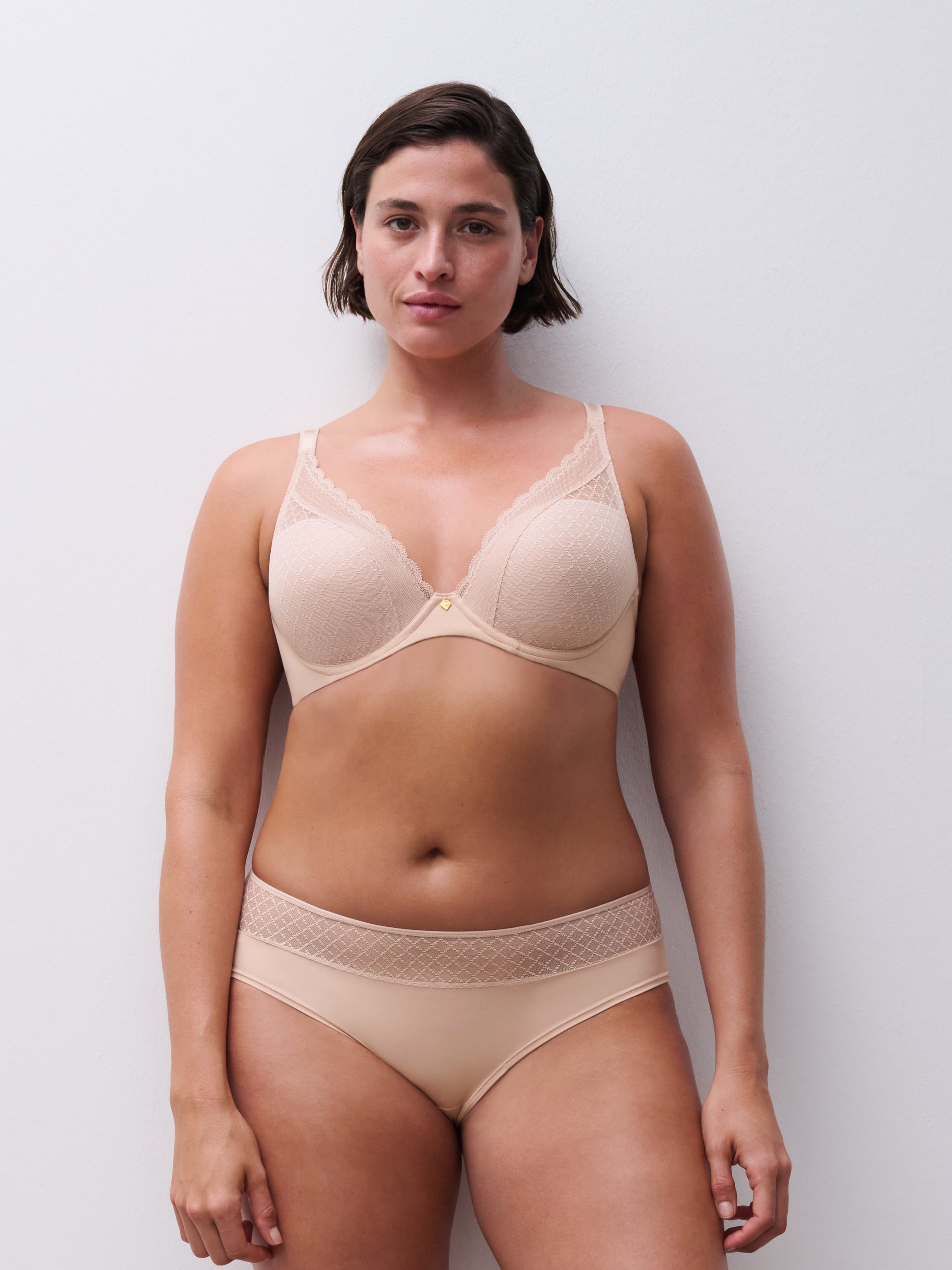 The Norah Chic Plunge T-Shirt Bra from Chantelle is a modern take on everyday comfort, where a chic graphic print lace meets soft and recycled materials in this eco-friendly fit. The plunge underwired t-shirt bra features contour cups for a rounded silhouette and a seductive neckline.